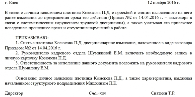 - Издать приказ о применении дисциплинарного взыскания к нарушителю. В этом документе должны быть прописаны пункты трудового договора, которые не были соблюдены работником, и приложены документы, свидетельствующие о проступке.