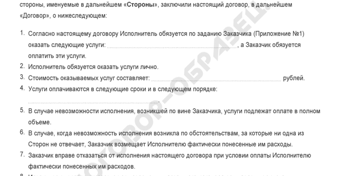 - Исполнитель оказывает Заказчику платные услуги (это может быть любая деятельность или действие).