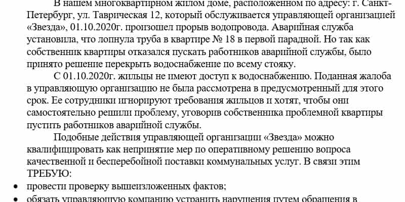 Представленный пример поможет правильно составить претензию к работе конторы в сфере обслуживания коммунального хозяйства. Если граждане боятся, что не справятся самостоятельно, то можно воспользоваться услугами опытного юриста.