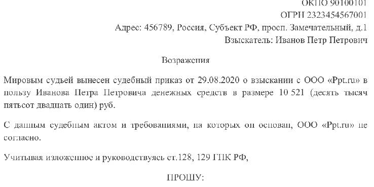 Порядок его направления не отличается от применяемого при оспаривании судебного приказа в установленный законом срок. Вместе с заявлением о восстановлении срока должник должен представить письменные возражения на вынесенный судебный приказ.