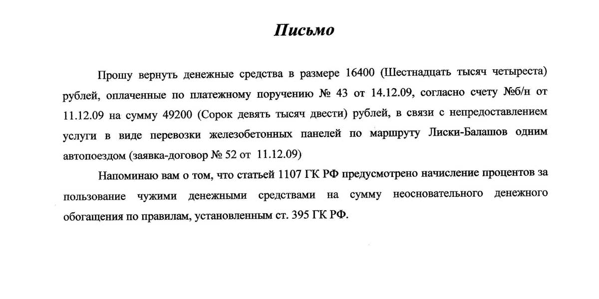 Письмо-претензия о возврате