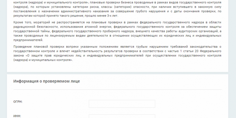 Помимо публикации сводного реестра проверяемых на сайте Генпрокуратуры, существует еще и специальный сервис (который также находится в ведении прокуратуры России) — ФГИС «Единый реестр проверок». Этим сводный план проверок отличается от единого реестра проверок: в нем отражаются сведения не только о планируемых контрольных мероприятиях, но и о тех, которые уже выполнены или еще проводятся в данный момент. Для использования этого ресурса необходимо ввести не только название организации, но и другие реквизиты. Форма ввода выглядит так: