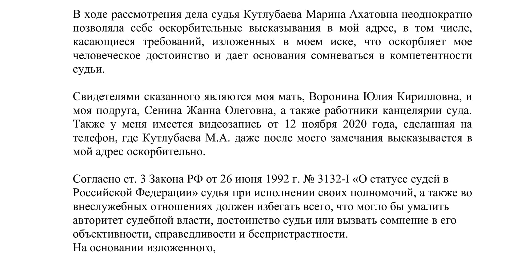 - Судья создает необоснованные препятствия одному из участников процесса для изложения своих доводов.